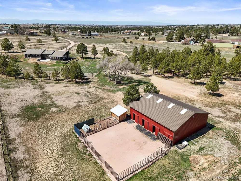 Somewhere over the rainbow, your dream horse property awaits. Nestled in a peaceful, lightly wooded pocket in the heart of Parker, this remarkable 11-acre estate blends designer touches, stylish finishes, natural beauty, convenience and equestrian excellence. Rolling meadows, mature towering trees, and carefully fenced pastures create an idyllic retreat for horse lovers & serenity. Though it feels like a secluded getaway, you’re just minutes from Old Town Parker, shopping, restaurants & amenities. Quick access to Parker Rd, 470, DIA, Southlands Mall & more! The best of both worlds:peaceful country living with city conveniences right around the corner. Inside, the beautifully updated home welcomes you with floor-to-ceiling windows that frame sweeping views in every direction. This home embraces the indoor/outdoor living concept. Nature surrounds you like living art—towering trees, wide-open skies, glorious snow capped mountain views, vibrant orange sunsets, abundant wild life and the iconic red barn in the distance. Sunlight fills the open-concept living area, featuring real wood floors, a cozy fireplace & refined finishes. The remodeled kitchen highlights upgraded cabinetry, granite counters, breakfast bar & stainless appliances. Enjoy peaceful quiet mornings or entertaining. The expansive primary suite serves as a luxurious retreat with a zen spa inspired 5piece bath, soaking tub, oversized glass shower, and spacious walk-in-closet. Large bedrooms provide comfort. Equestrian amenities include a fully outfitted Morton barn with 4 stalls(plus room to add more stalls), rubber mats, electricity, water, a tack room, loft storage & direct stall paddock. Additional highlights:Gently grass pastures with mountain views, a high fenced deer-proof 1.5 acre enclosure around the home & chicken coop. Recent upgrades ensure peace of mind: a new roof, Hardie siding, upgraded windows, 1,500-gallon poly septic tank (new 2020) & updated insulation. More than a home—it’s a lifestyle.