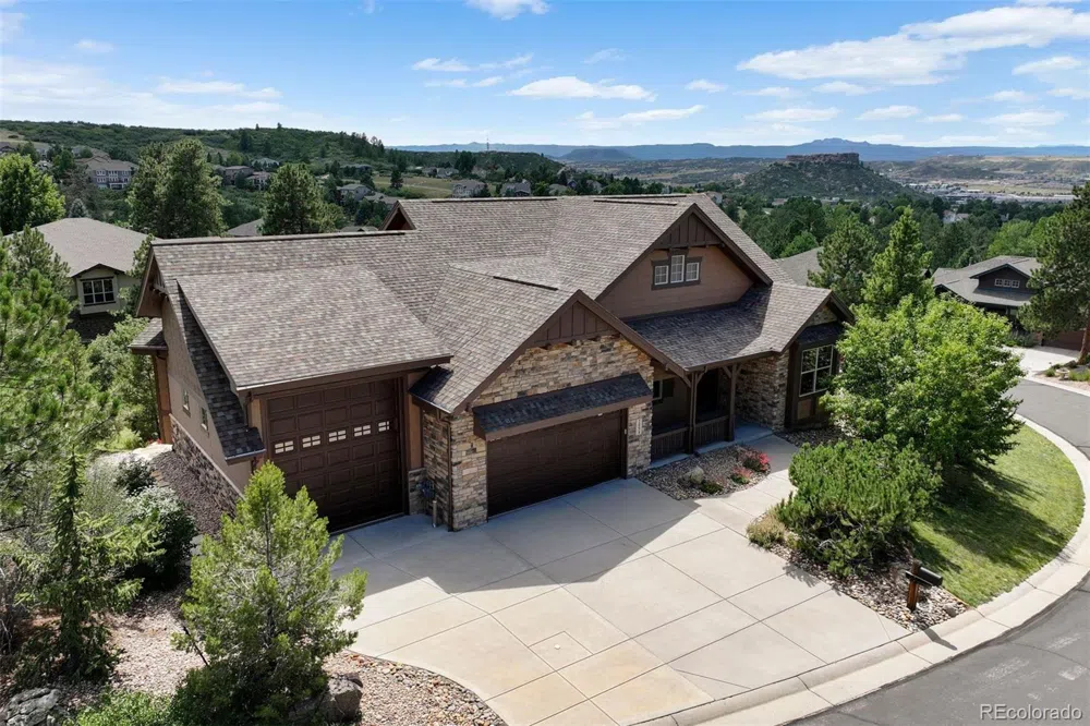 Welcome to this beautifully updated ranch-style home in the exclusive Escavera neighborhood of Castle Rock. As you step through the craftsman-style front door, you're greeted by a formal dining room with tray ceilings and large windows offering views of the open space across the street. The dining room connects to the updated kitchen through a butler's pantry, featuring cherry cabinets, granite countertops, a large island, and newer appliances. A sliding glass door opens to a spacious covered composite deck with peek-a-boo views of The Rock and Devil's Head. The kitchen flows into a great room with high ceilings, large windows, and a redesigned fireplace with a single-slab granite surround and wood mantle. The main floor primary bedroom offers uplit tray ceilings and large windows. The updated primary bathroom includes a glass-enclosed shower, granite counters, and a walk-in closet with custom built-ins. The main floor also features a large laundry room, a full bath, and an additional bedroom currently converted to a home office.. The wrought iron staircase leads to a walk-out lower level, perfect for customizing to fit your lifestyle. The one-of-a-kind bar with a copper sink and raw-edged granite is ideal for entertaining. Walk out to a covered extended patio with a unique fire wall, perfect for cool evenings. Two large secondary bedrooms and a full bathroom complete this level, along with a substantial unfinished storage area. Custom plantation shutters and crown molding have been added throughout the home creating an inviting feel. The 5-car attached garage is a highlight, with a 12' door for RV storage, epoxy floors, full finishing, heating, and built-in cabinets, counters, and a sink. The low-maintenance lot, surrounded by mature trees, provides privacy for the yard and lower patio.