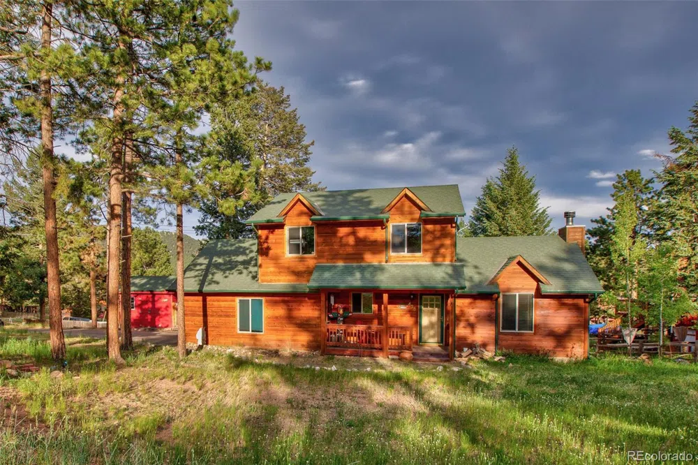 Elegant cedar sided home in Woodland Park on a corner lot with views of Rampart Range. Several new amenities have been added to include; High efficiency furnace in 2020; Hot water heater in 2022; radon mitigation system added in 2017; master bathroom renovated in 2020 w/new walk-in shower; new laminate wood flooring and carpeting in the upper level and lower level of the home; stainless steel microwave oven and refrigerator. This comfortable home has 2 story vaulted ceilings upon entering, with beautiful rustic Hickory hardwood flooring throughout the main level. Living area is centered around the fireplace, w/ wood-burning stove insert for wonderful heat in the colder months of the year. A "live edge" knotty pine counter-bar is located nearby the kitchen. Newly updated kitchen includes solid granite counter-tops and Hickory cabinetry and loads of storage. Adjacent the kitchen is a powder room. The back of the home has a magnificent bright and cheery separate dining room which leads onto the back composite, low maintenance deck and patio and into the fenced yard. The back yard has many features including a complete treehouse for the kiddos, and landscaped rock terrace flower beds w/ stairway into the lower yard and patio off the lower level family room. Entering the upper level of the home, the master suite has windows surrounding, for a wonderful cheery and bright start to your day, adjoining a 3/4 bath, w/ new custom shower, a walk-in closet, and a dressing room attached, (formerly a bedroom and can be returned to a 5th bedroom). 2 additional bedrooms on this level plus a hallway full bathroom complete this space. The lower level living space includes a recreation/family room with a glass slider to the rear yard, and adjoins an additional 4th bedroom w/ a 3/4 bathroom + laundry attached. Your kids likely won't come out of the treehouse in this yard!