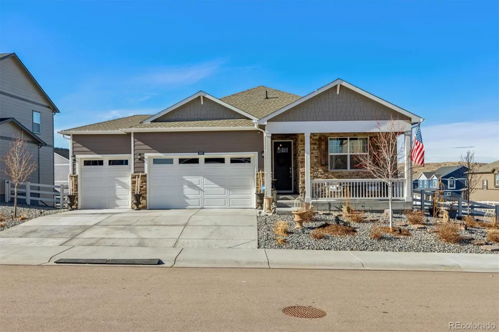 Welcome to this beautifully maintained ranch home, ideally located on a corner lot in the highly sought-after Crystal Valley Ranch community. Thoughtfully designed for both comfort and functionality, this home offers a bright, open layout and tasteful upgrades throughout. The kitchen and great room are truly the heart of the home, creating an inviting space for everyday living and entertaining. The kitchen features white cabinetry, quartz countertops, stainless steel gas range, microwave, and dishwasher. It flows seamlessly into the living area with durable wide-plank vinyl flooring throughout the main living spaces. The main level includes neutral designer paint, updated lighting and mirrors, 2-panel interior doors, quartz countertops in all bathrooms, custom mantels on both fireplaces, central A/C, and a tankless hot water heater. A spacious three-car garage offers plenty of room for vehicles, storage, or hobbies. Step outside to enjoy the extended patio, perfect for relaxing or entertaining, along with professionally landscaped ($12K) front and rear yards. Its already fenced and ready for your personal touches. The NEWLY finished ($35K) garden-level basement is filled with natural light and features an expansive family room with an electric fireplace and custom shelving. This flexible space offers endless possibilities for a future bar area, theater room, game area, or additional bedrooms. A ¾ bathroom and generous storage are already in place, with the option to easily add walls for a conforming bedroom. Enjoy living in a vibrant community with parks, trails, clubhouse, pool, and fitness center—offering the perfect balance of work, live, and play!