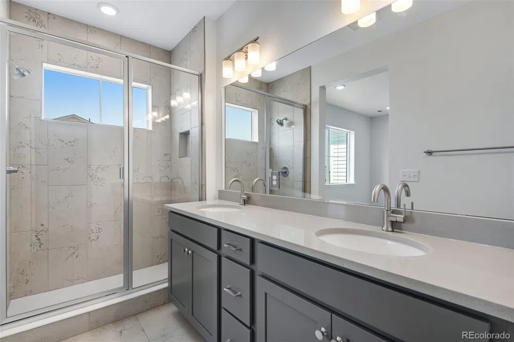 This beautiful new paired home offers an open floor plan with a finished basement featuring an additional bedroom and full bathroom. Both the kitchen and primary suite offer light quartz countertops with contrasting dark grey cabinetry. Relax by the gas fireplace in the great room or enjoy the outdoors on your covered back patio. Situated in the heart of Castle Pines, The Canyons merges new homes with nature by restoring the native landscape and upholding an etic of preservation. Almost one-third of the community is dedicated to outdoor space in the form of parks, 15 miles of trails, and open space. Gather with family and neighbors at The Exchange for coffee and events or take advantage of the amenities at Canyon House with a resort-style pool and spa, fitness center, patio with firepits, and pickleball courts. Community events abound with a monthly music series and larger holiday festivals.