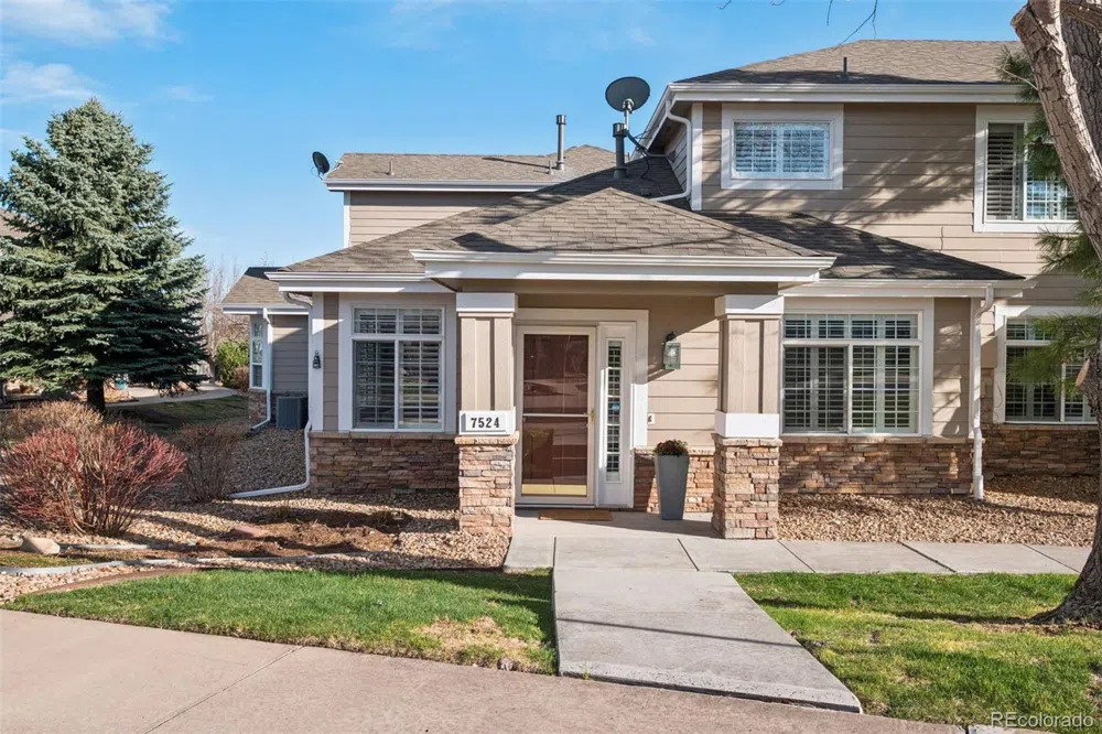 Discover effortless living in the highly desirable Pineridge community of Castle Pines, nestled beside The Ridge Golf Course and overlooking the scenic beauty of Daniels Park. This impeccably updated end-unit townhome offers the perfect balance of tranquility and modern comfort. Step inside to find a thoughtfully renovated interior where timeless design meets everyday functionality. The kitchen has been enhanced with fresh white subway tile, beautifully complementing the existing slab granite countertops, stainless steel appliances, and white cabinetry with pull-out drawers and updated hardware. A new GE Cafe induction stove and convection double ovens bring elevated performance and sleek efficiency to this stunning culinary space. The inviting living room centers around a modernized stone gas fireplace, while plantation shutters and 5” luxury vinyl hardwood flooring add a touch of refined elegance throughout. The main level features a secondary bedroom with a walk-in closet and a fully remodeled bath, plus a dedicated office complete with a custom Elfa built-in desk—ideal for working from home. Upstairs, the spacious primary suite offers a true retreat with two generous walk-in closets, including one with custom Elfa shelving, and a spa-inspired bath featuring granite counters, dual sinks, and a walk-in shower. The included stairlift system ensures the upper level remains easily accessible for all. Additional conveniences include a 2020 HVAC upgrade (furnace and AC) controlled by an Ecobee Nest thermostat. Outside, the current owners have refreshed both garden beds and created a peaceful escape on the private side patio off the kitchen. The HOA has taken great care of the community with a new roof in 2019, and fresh exterior paint completed in summer 2024. Enjoy sweeping views of Castle Rock and Pikes Peak in this exceptionally quiet and well-maintained neighborhood, just minutes from trails, golf, shopping, and I-25. This is more than a home—it’s a lifestyle.